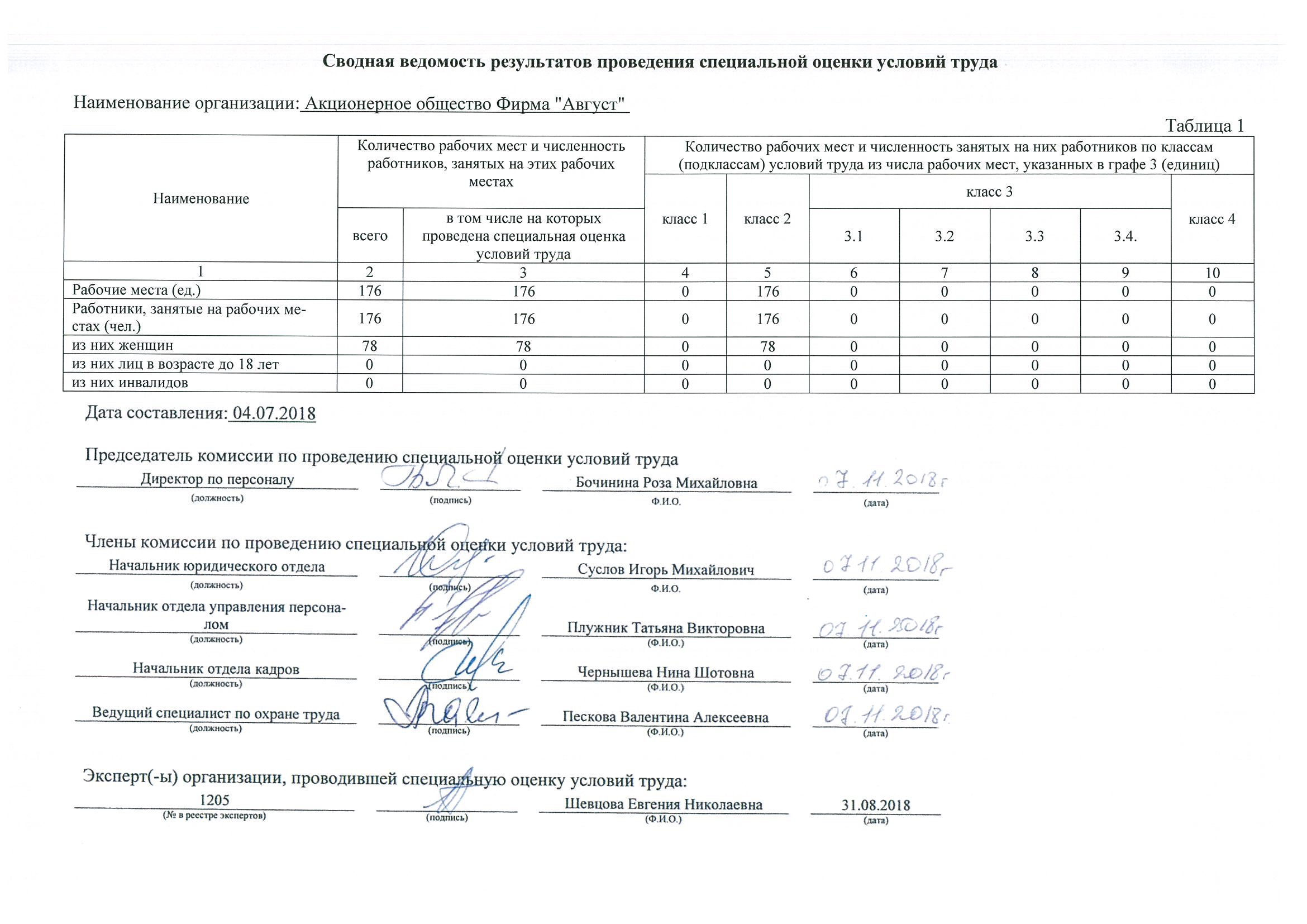 В соответствии со статьей 15 (часть 6) Федерального закона от 28.12.2013г. № 426-ФЗ «О специальной оценке условий труда» АО Фирма «Август» с учетом требований законодательства РФ о персональных данных и законодательства РФ о государственной и об иной охраняемой законом тайне, организует размещение на своем официальном сайте в информационно-телекоммуникационной сети «Интернет» сводных данных о результатах проведения специальной оценки условий труда в части установления классов (подклассов) условий труда на рабочих местах и перечня мероприятий по улучшению условий труда и охраны труда работников, на рабочих местах которых проводилась специальная оценка условий труда.