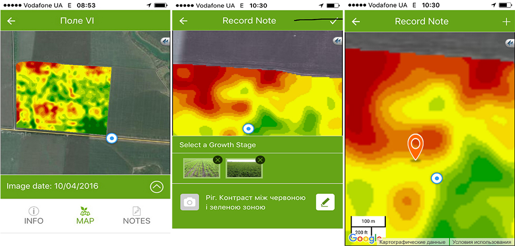 В начале мая на «поле-онлайн» ООО «Хлебодар» Сумской области Украины успешно протестировано специально разработанное приложение «Croptical in Field» на посевах озимой пшеницы. Это приложение дает возможность эффективно определять проблемные участки поля, оптимизировать маршрут агронома и выполнять агротехнические мероприятия по картам неровностей поверхности поля, основанных на индексе вегетации растений (NDVI). Этот индекс отображает разницу между поглощением и отражением световых лучей в процессе фотосинтеза и, по сути, измеряет развитие сельскохозяйственных культур. Чем активнее происходит процесс, тем выше индекс вегетации и соответственно – потенциал урожайности культуры.