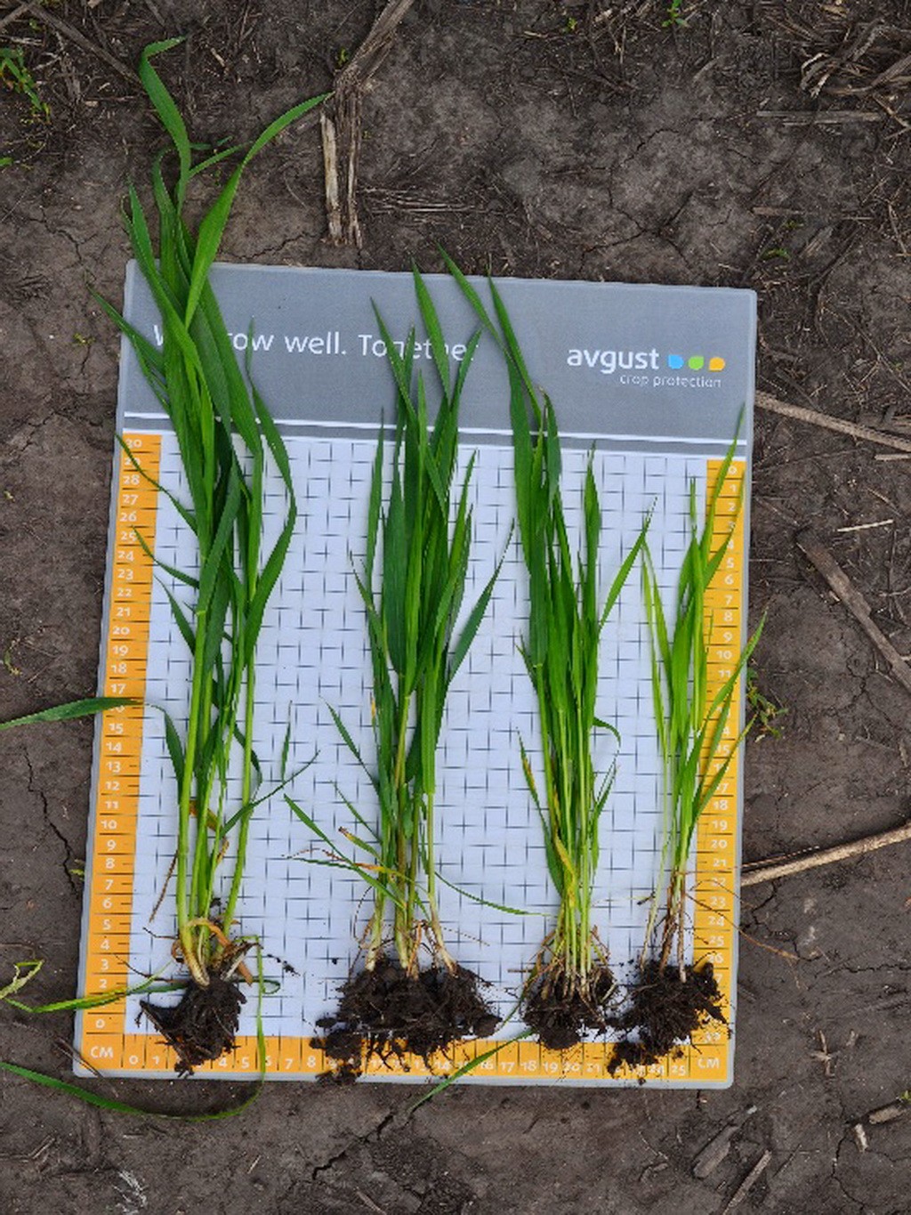 Фото 6 Образцы растений, отобранных с разных зон поля (слева направо): из темно-зеленой зоны (индекс NDVI 0,66 ед.), зеленой – 0,60, желтой – 0,57 и из красной зоны – 0,51 NDVI.
