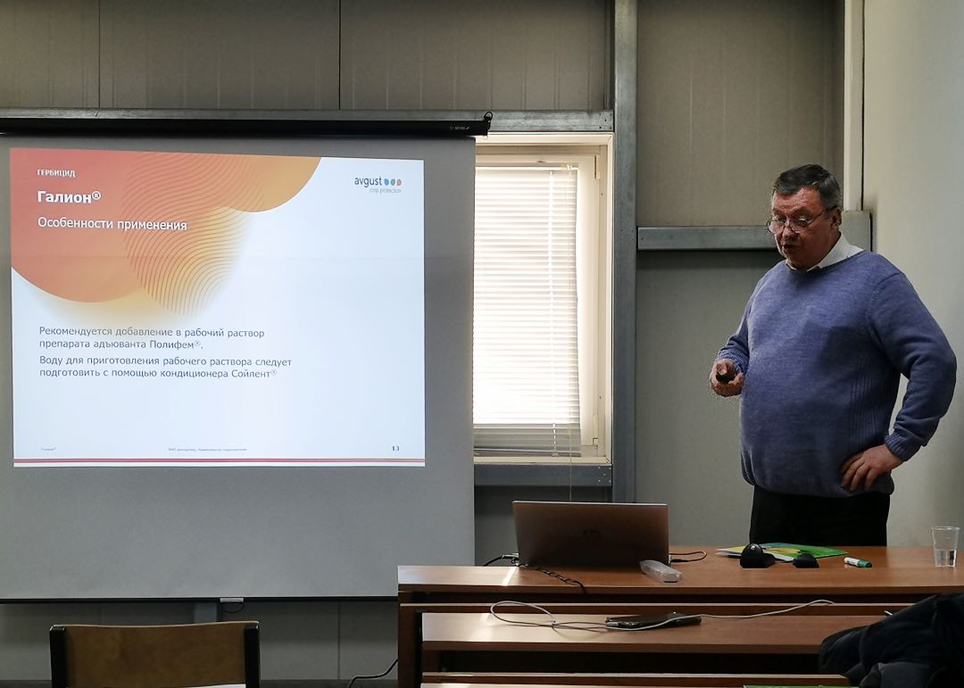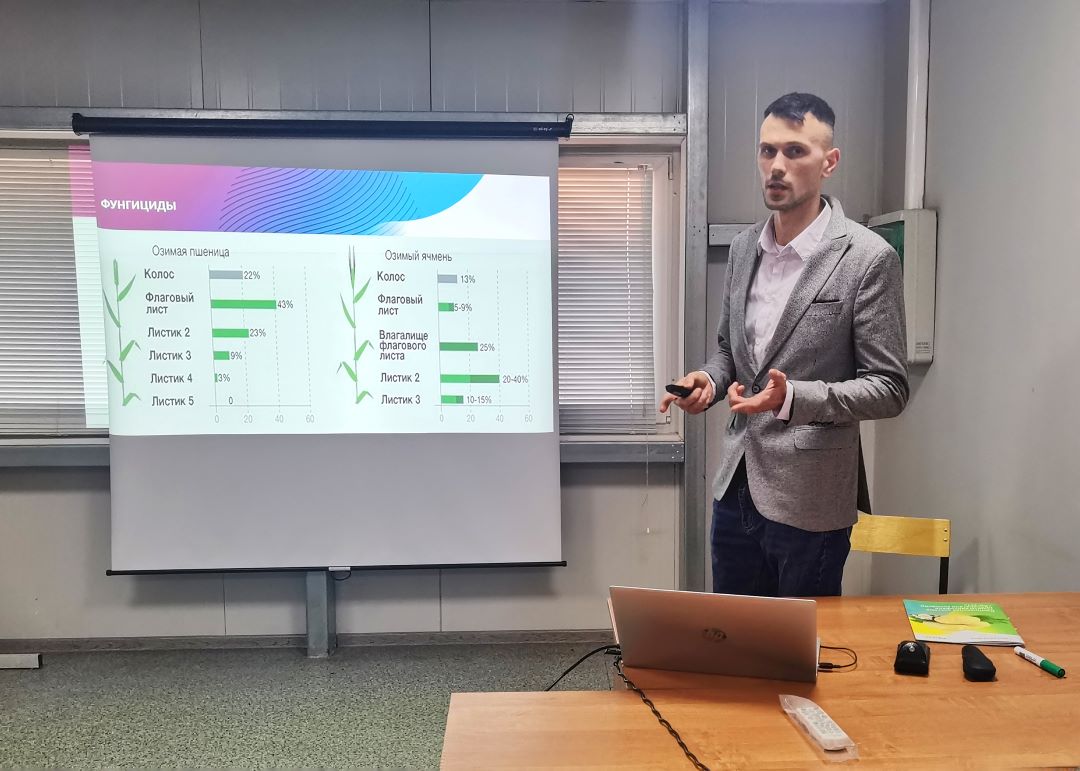 Гостей приветствовали ведущий специалист группы по Центральному и Северо-Западному региону А. Старшов и менеджер по продажам в Санкт-Петербурге В. Жуков. Сотрудники отдела развития продуктов А. Аниськов и С. Бочкарев рассказали о защите картофеля и овощей, а их коллеги – А. Гуртовой и Е. Ручков – о защите зерновых и рапса.