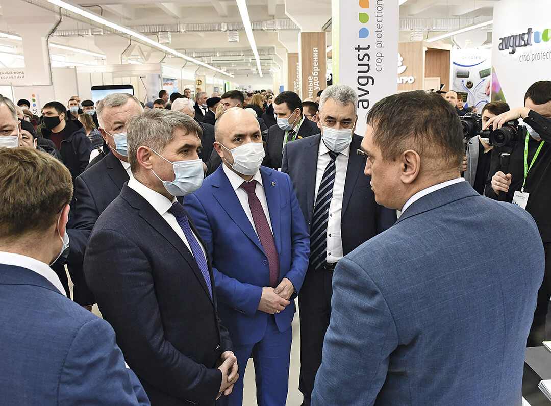 Глава Чувашской Республики О. А. Николаев (слева) при посещении стенда «Августа» на выставке «Картофель-2021»