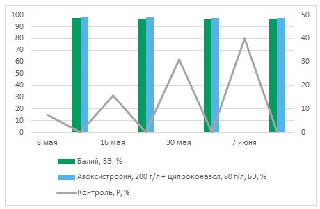 Через 22 дня после двукратной обработки фунгицидами их БЭ против пиренофороза находилась в пределах от 82,6 % до 88,3 %, а разница между Балием и стандартом в развитии болезни составила всего 1,5 % при значительном развитии болезни в контроле без обработки (24,7 %) (график 1).