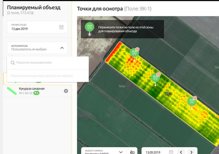 · помогает поставить точки осмотра на карте, сформировать задание на объезд агроному или консультанту и направить его именно в проблемную зону;