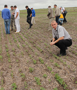 Наших людей в хозяйствах интересовало буквально все, особенно состояние посевов. Декабрь в Аргентине – это наш июнь, поэтому на полях мы чаще наблюдали либо уборку зерновых, либо всходы сои в состоянии двух-трех настоящих листьев после уборки пшеницы, ячменя или кукурузы. Иными словами, посев здесь был выполнен три-четыре недели назад, после этого прошли небольшие дожди – и соя начала расти, рядки обозначались под углом к рядкам предшественника. Это одно из правил No-till, направление посева на поле здесь меняют каждый год.