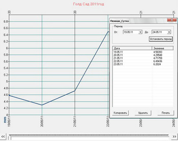 Скажем прямо, агрономам вряд ли стало от этого легче. Ибо постоянно фиксировать целый ряд погодных параметров, да потом еще и производить столь сложные расчеты вряд ли покажется реальным. Все радикально изменилось с появлением цифровых автоматических метеостанций. Большинство этих системных устройств (по сути своей это узкоспециализированные компьютеры) умеют не только самостоятельно фиксировать десятки видов погодных данных, но и рассчитывать суммарное испарение по Пенману - Монтейту. На рис. 2 приведен скриншот программы «Phytograph», на котором видно, как система сама не только рассчитала испарение за каждый день, но и выразила его графически и таблично. Остается только просуммировать эти цифры за период от последнего полива, отнять осадки (если они были) и умножить все это на коэффициент по культуре (справочные данные по этому вопросу наиболее полно изложены в книге «Основы фитомониторинга», О. А. Ильницкий, Херсон, изд. «Айлант», 2005). А разделив полученное число на количество дней, получим среднесуточное значение.