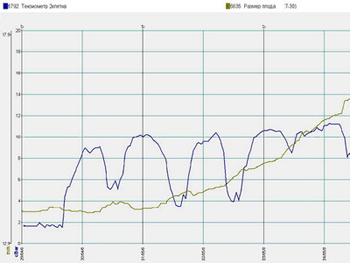 Сравнивать можно не только данные с основного датчика с контролем. Важно также наблюдать динамику в развитии (замедлился рост плода или ускорился, если замедлился, можно разобраться – почему, накладывая данные друг на друга). На фото 4 показано, как сопоставление динамики роста плода позволяет оценить правильность режимов полива (замедление роста плода после полива означает перелив, резкое возрастание скорости – сигнал к пересмотру режима орошения в сторону увеличения).
