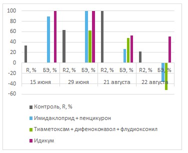 По всем датам учетов наилучшим защитным действием и наивысшей эффективностью среди сравниваемых препаратов обладал Идикум. Все испытанные препараты не проявили фитотоксичности для картофеля.