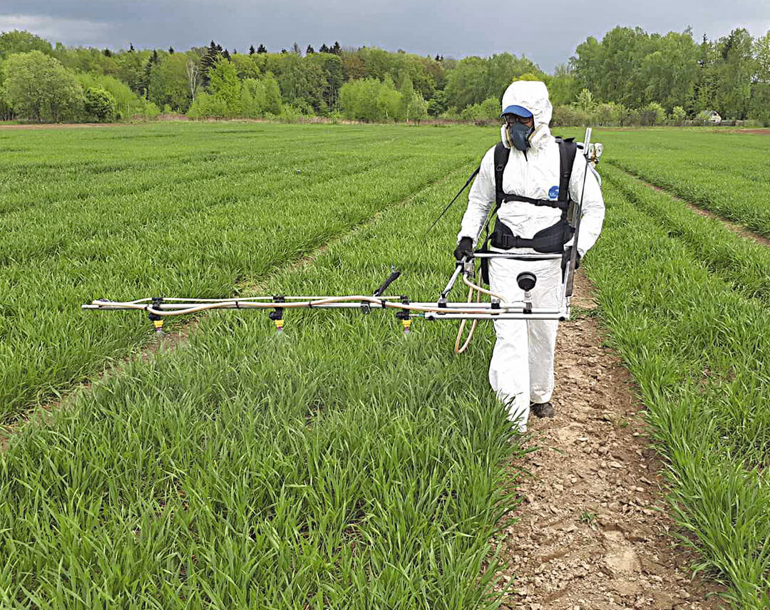 Обработка опытных делянок ручным специализированным опрыскивателем