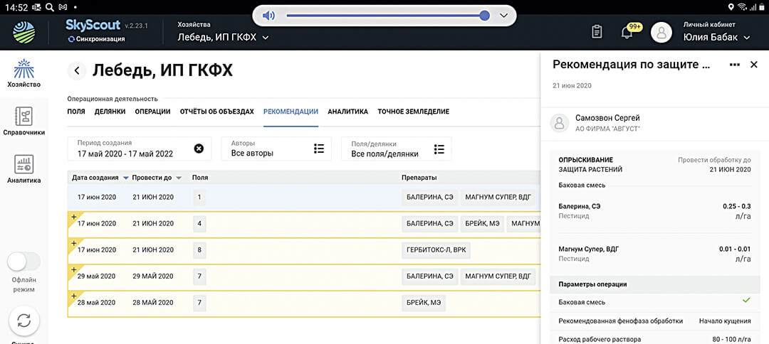 Специалисты, которым удалось вникнуть в суть данного сервиса и осознать его возможности, получили отдачу и понимают, зачем нужно его внедрять. Более того, те, кто полностью прошел весь сезонный цикл наблюдений и работ, готовил объезды, формировал отчеты с использованием данных удаленного мониторинга, фиксировал проблемы в поле, публиковал рекомендации для агрономов по проведению защитных мероприятий и контролировал их исполнение, имеют полную картину всего, что происходило в полях. И «августовские» технологи, и агрономы хозяйств смогли оценить, что предотвратил «SkyScout», выявив проблемные поля или участки, на которых вовремя были проведены химобработки.