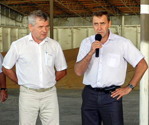 С. А. Шумский (с микрофоном) делится опытом протравливания семян, слева – глава Кочубеевского представительства «Августа» С. Н. Кузьмишкин