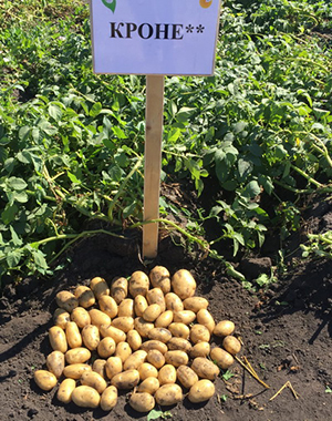 Сорт Кроне создан селекционерами немецкой компании «Bavaria-Saat». Он образует 14 - 16 клубней овальной или удлиненно-овальной формы равномерной калибровки с гладкой золотисто-желтой кожурой, поверхностным залеганием глазков и желтой мякотью. Обладает отличными вкусовыми качествами.