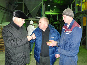 Справа налево А. В. Агибалов и Д. Е. Иноземцев и А. Н. Селезень в цехе по переработке люпина и сои