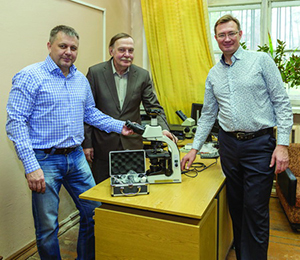 Директор по маркетингу и продажам «Августа» М. Е. Данилов (слева) и А. Ю. Шуркин вручают профессору кафедры защиты растений В. В. Гриценко (в центре) один из подаренных Тимирязевке современных микроскопов