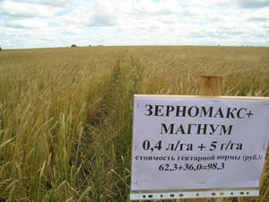 На демонстрационном поле участникам семинара были представлены семь вариантов защиты зерновых культур с применением протравителей виал ТТ (0,4 л/т) и витарос (3 л/т), гербицидов в составе популярных в области баковых смесей магнум (10 г/га) + топик (0,4 л/га); магнум (7 г/га) + диален супер (0,2 л/га) + топик (0,4 л/га); магнум (5 г/га) + прима (0,3 л/га) + топик (0,4 л/га) и магнум (5 г/га) + зерномакс (0,4 л/га) + топик (0,3 л/га), а также варианты с использованием фунгицидов колосаль (0,5 л/га) и тилт (0,5 л/га), инсектицида шарпей (0,2 л/га) против трипсов.