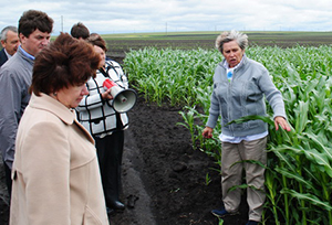 Проливной дождь не очень располагал к осмотру опытных делянок, но, несмотря на это, все гости проявили большую заинтересованность. Они задавали много конкретизирующих вопросов по всем аспектам эффективности и различного действия препаратов по вариантам опытов и в сравнении с контролем.