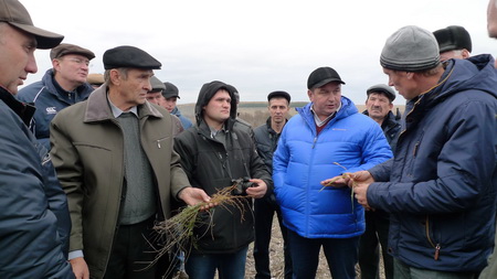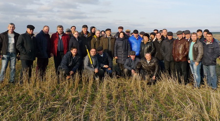 Участники семинара на поле озимой пшеницы, посеянной с озимой викой после ячменя, убранного очесывающей жаткой