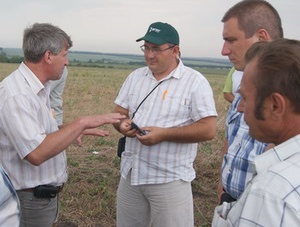 На опытных участках были продемонстрированы результаты действия нескольких баковых смесей гербицидов: деметра + гранстар, балерина + магнум, балерина + деметра. Данные схемы были предложены для того чтобы показать новые продукты – балерина и деметра, появившиеся в ассортименте компании в 2010 году. Поле, отведенное под опыты, введено в севооборот недавно, так что препаратам было с чем бороться, и баковые смеси сработали на достаточно высоком уровне. Хотя жаркая погода и внесла свои коррективы. Некоторые сорняки погибали и на контроле, чего не скажешь о мари белой, которая вопреки суровым погодным условиям оставалась зеленой. С овсюгом, который тоже является в хозяйстве проблемой, успешно справился граминицид ластик 100, примененный в норме расхода 0,6 л/га.
