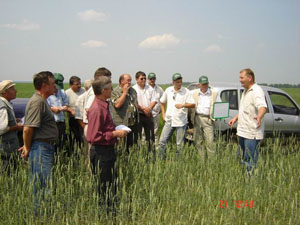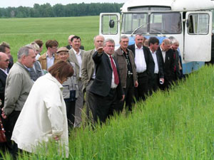 Участники семинара осмотрели опытные поля БГУ, познакомились с результатами демонстрационных испытаний различных препаратов отечественных и зарубежных фирм на ряде культур. В частности, собравшиеся отметили высокую биологическую и экономическую эффективность препаратов фирмы «Август» на посевах яровой пшеницы: протравителя семян виал ТТ (0,4 л/т), гербицидов магнум (10 г/га), диален супер (0,7 л/га), баковой смеси диален супер (0,2 л/га) + магнум (7 г/га), топик (0,4 л/га), фунгицида колосаль (0,7 л/га).