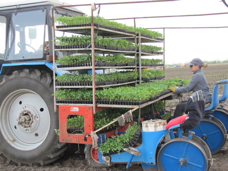Еще одно поле на Украине – и снова в Херсонской области – ведет Александр Кыливник. Он подробно описывает операции, проведенные на томате рассадных гибридов Лампо F1 и Адванс F1. Высадку рассады произвели с 1 по 20 мая, а до этого выполнили полный лабораторный анализ почвы, чтобы оценить потребность в минеральном питании, уложили трубки капельного полива и внесли через них гербициды по влажной почве (препарат на основе S-метолахлора, 1,6 л/га + Лазурит, 0,5 кг/га). На этом поле все операции осуществлялись «по высшему разряду», даже высадка рассады производилась рассадопосадочными машинами «Ferrari»… После нее произвели полив, а затем выполнили профилактику болезней и вредителей. От почвенных вредителей внесли в капельную трубку препарат Табу, 0,4 л/га. В целях профилактики грибных заболеваний и бактериоза на четвертый день провели обработку Орданом, 2,5 кг/га. Чтобы защитить растения от переносчиков вирусных заболеваний (тля, трипс, цикадка), на седьмой день после высадки была проведена обработка Бореем, 0,12 л/га.