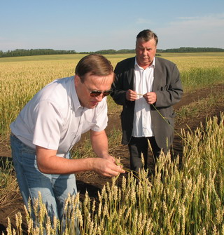 На правом снимке: Ю. И. Толстиков осматривает посевы вместе с главой Красноярского представительства фирмы «Август» Л. П. Столяром.