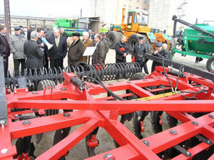На смотровой площадке ЗАО «Назаровское» участники совещания смогли познакомиться с некоторыми образцами техники для ресурсосберегающих технологий, уже успешно применяемыми в крае. Это дискаторы БДМ-6 и БДМ-8, посевные комплексы «Кузбасс» и «Томь», протравочная машина ПК-20 «Супер» и др. Но настоящим «хитом» стала 18-метровая пневматическая сеялка «Сэлфорд», оснащенная (по заказу ЗАО «Назаровское») сошниками, способными вести подпочвенный широкополосный посев одновременно с внесением двух доз разных (!) удобрений – первой на уровне семян, второй – на 2 см ниже. Для эффективного работы этой сеялки в «Назаровском» приобрели трактор «Нью Холланд» мощностью 530 л. с.