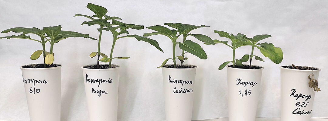 Тест-объектом выбрали подсолнечник, который «августовские» специалисты часто используют в этом качестве в своих исследованиях. Это растение чувствительно к бентазону – действующему веществу Корсара. Воду для приготовления рабочего раствора искусственным путем довели до средней жесткости (электропроводность 560 - 564 Мксм/см), которая часто встречается в реальных условиях хозяйств. Для сравнения, показатель электропроводности водопроводной воды в «августовской» лаборатории составляет около 320 Мксм/см.