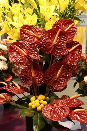 На снимках: на экспозиции фирмы «Август»; букет антуриумов.