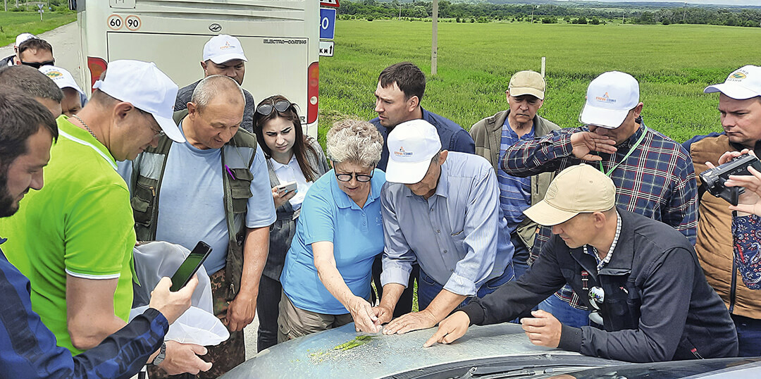 У нас с собой был энтомологический сачок, «покосили» им и обнаружили только несколько отдельных экземпляров злаковой тли и имаго трипсов. Благодаря своевременному применению инсектицидов проблем с вредителями не было. Но надо отметить еще и то, что на полях с прямым посевом вредные насекомые хорошо контролируются энтомофагами – в сачке находилось очень много наездников. Видимых проявлений болезней также не наблюдалось, так как за 10 дней до нашего приезда, скорее всего, по первым симптомам была проведена фунгицидная обработка, и поле замечательно выглядело. А мы сделали вывод, что Семен Григорьевич получит тот урожай, который запланировал.