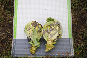 Спустя две недели провели запланированное опрыскивание вариантов баковой смесью гербицида Галион, 0,28 л/га и фунгицида Раёк, 0,3 л/га против альтернариоза (пока не зарегистрирован для применения на капусте) с добавлением адъюванта Аллюр, 0,2 л/га. В этот момент культура достигла фазы четырех - шести листьев. Биологическая эффективность Галиона составила 91 %. Что касается действия фунгицида Раёк, то на варианте «Августа» не отмечались такие болезни, как ложная мучнистая роса (пероноспороз) и альтернариоз. А на контрольном участке на некоторых растениях уже начинали проявляться симптомы ложной мучнистой росы, причем на их поврежденных листьях был отмечен слизистый бактериоз.