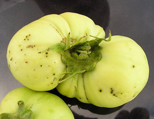 Бактериальная крапчатость – заболевание томата, возбудителем которого является фитопатогенная бактерия Pseudomonassyringae(как и у бактериальной точечности плодов). На еще зеленых плодах образуются мелкие, черные и выпуклые пятнышки, которые легко удаляются. Ткань под пятнами хлоротическая, слегка вдавленная, но не повреждена, гниль не развивается. Часто пятна сливаются и образуют широкие черные зоны струпьев, которые могут охватить весь плод.